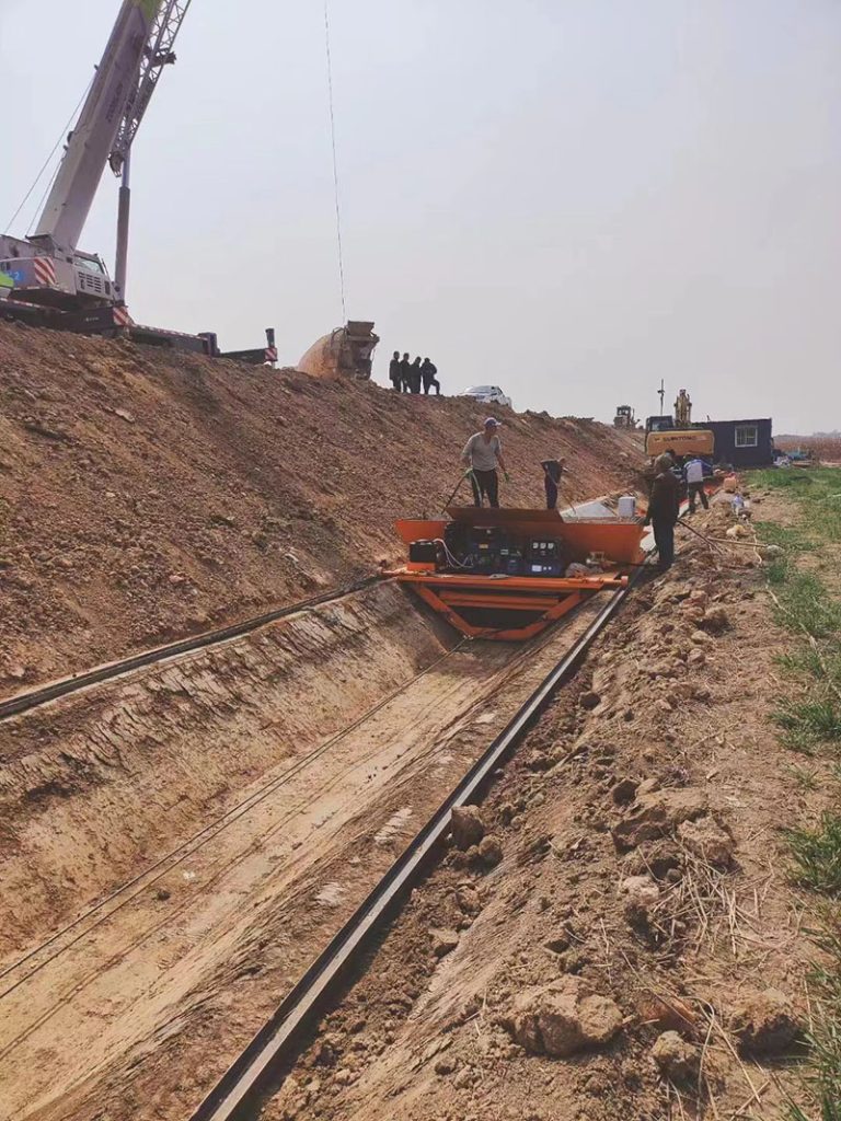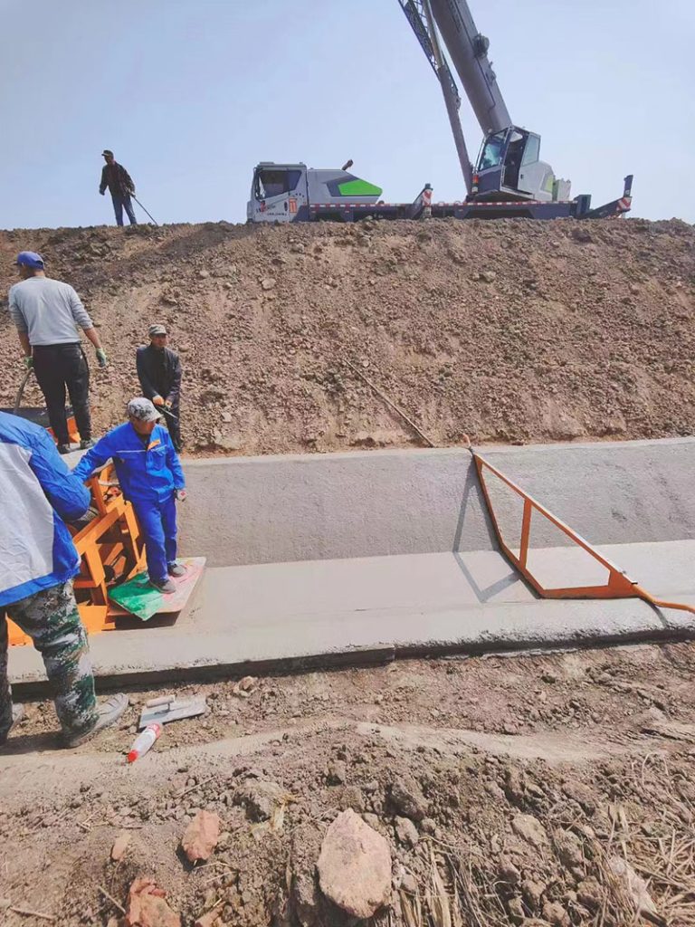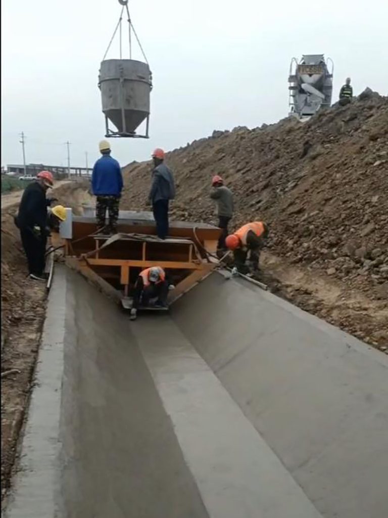 看下這個現場,高速公路的排水溝在公路的坡下,這就造成了增大上料花費的問題,因為坡度大,垂直高度也大。只能選擇采用吊車上料。普通的情況下如果和道路挨著,罐車是可以往機器里面卸料的。而如今這個現場,只能通過罐車放料到漏斗里面,吊車吊著漏斗去給機器上料。雖然有點耽誤時間,但是總體算下,使用機械施工的速度還是人工施工的好幾倍。