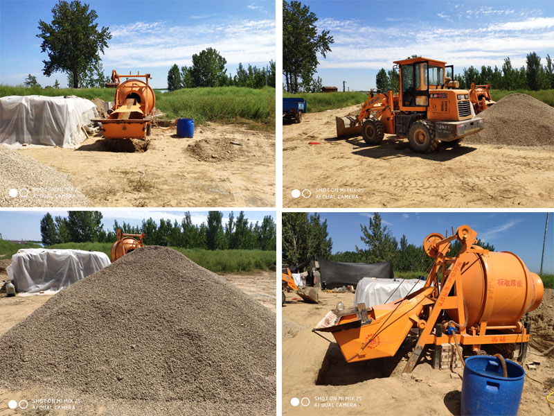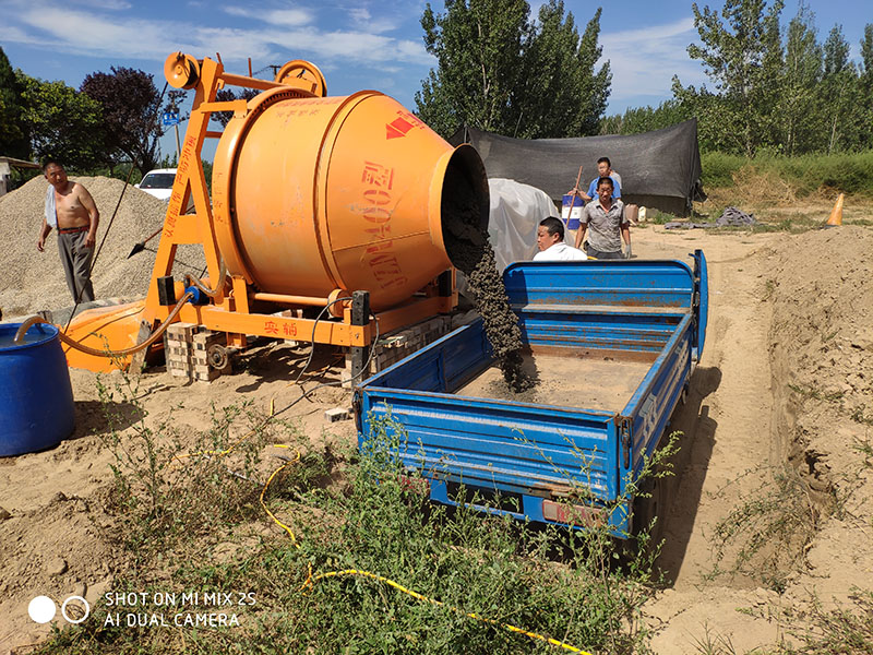使用滾筒攪拌機制造混凝土,三輪車拉料。因為場地的原因,客戶只能使用農用三輪車拉料,人工上料。好在客戶的水渠規格不大。